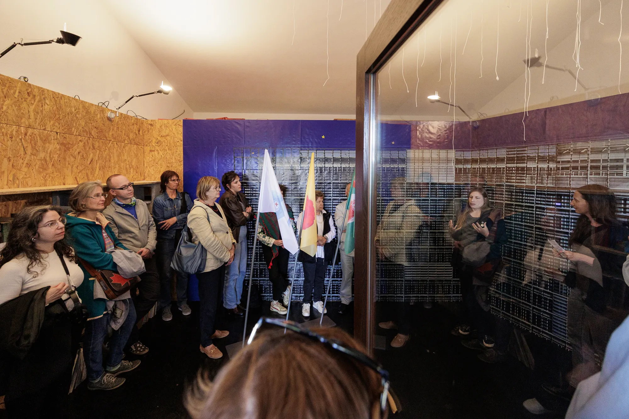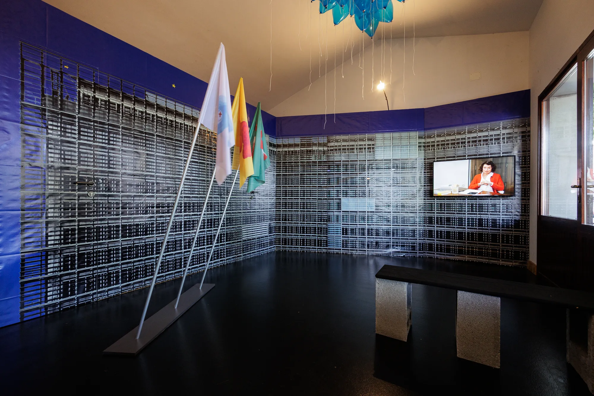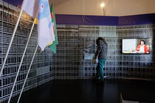 Prostorsko postavitev razstave Politika Mačka med vrati v Carinarnici uokvirja panelna podoba zgradbe Evropske komisije, ki ponuja ogled insertov animacije in intervjujev z Aigul Hakimovo, članico iniciative Infokolpa, ter dr. Mirjam Milharčič Hladnik, sociologinjo in znanstveno svetnico na Inštitutu za slovensko izseljenstvo in migracije Znanstvenoraziskovalnega centra Slovenske akademije znanosti in umetnosti.
