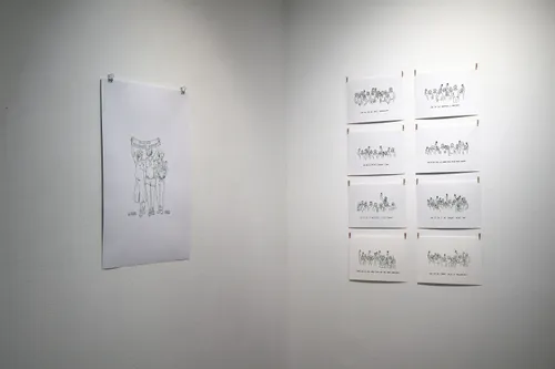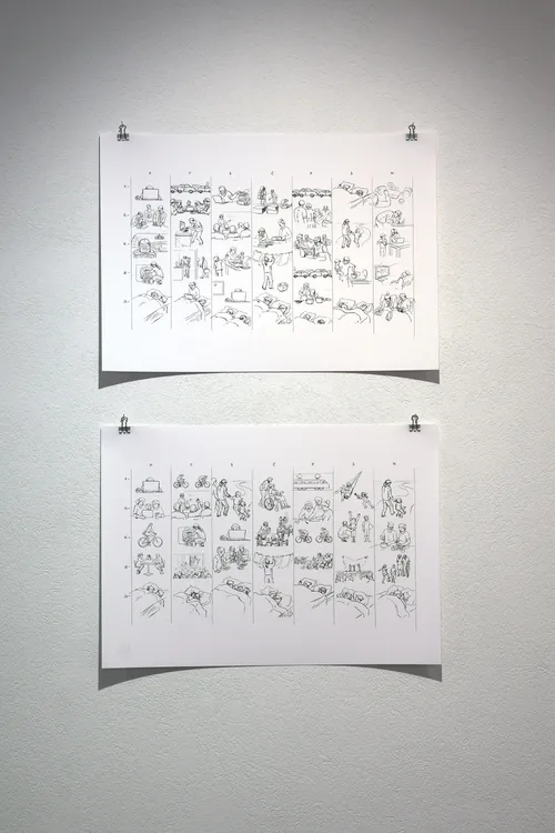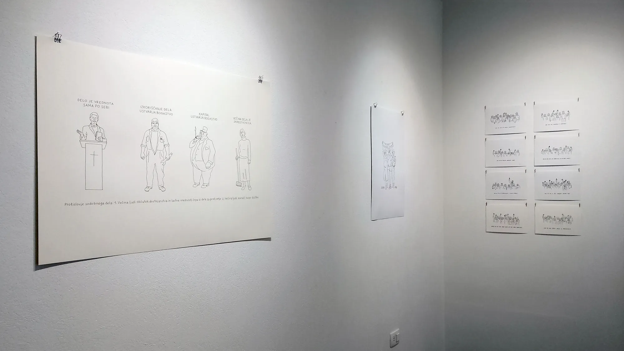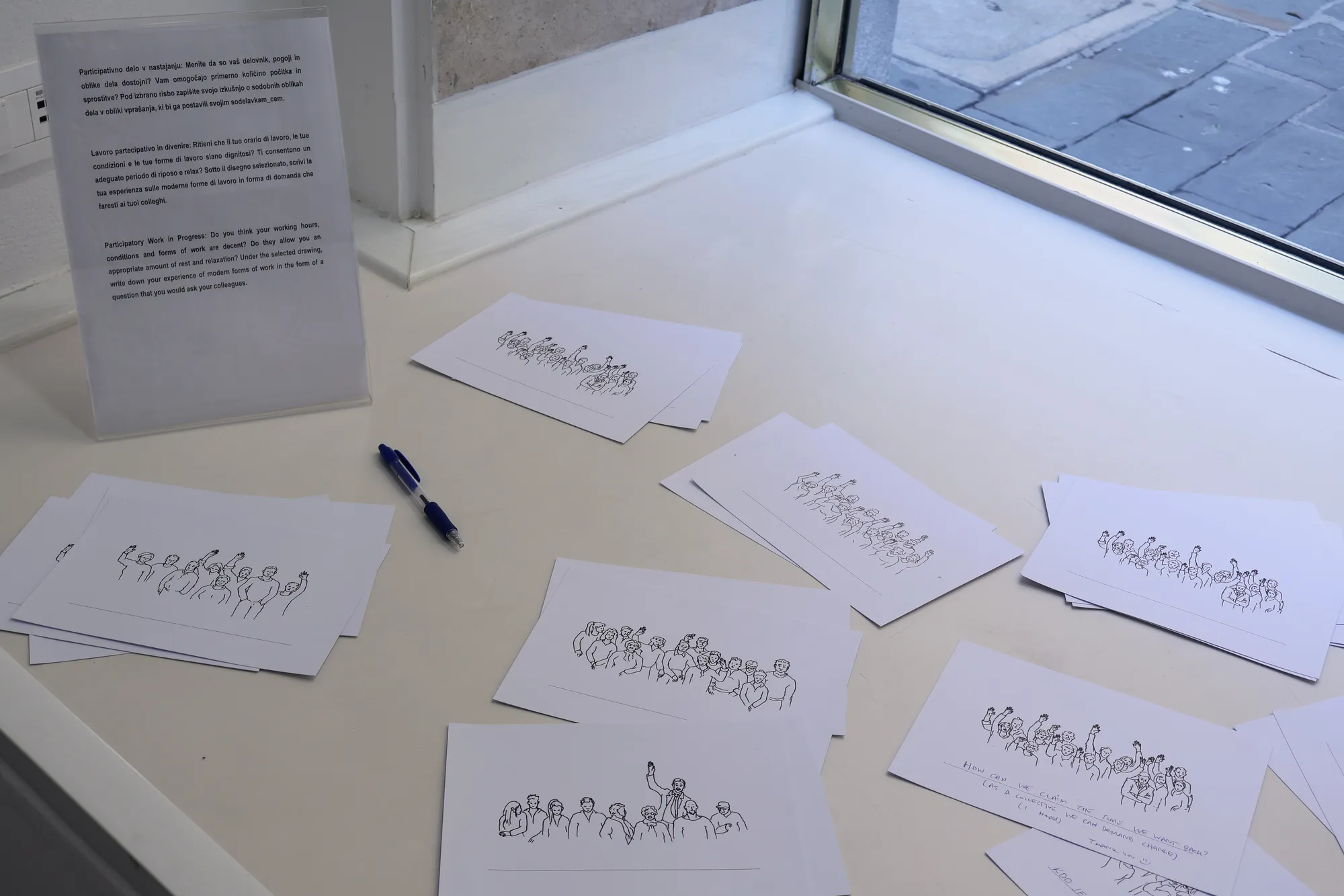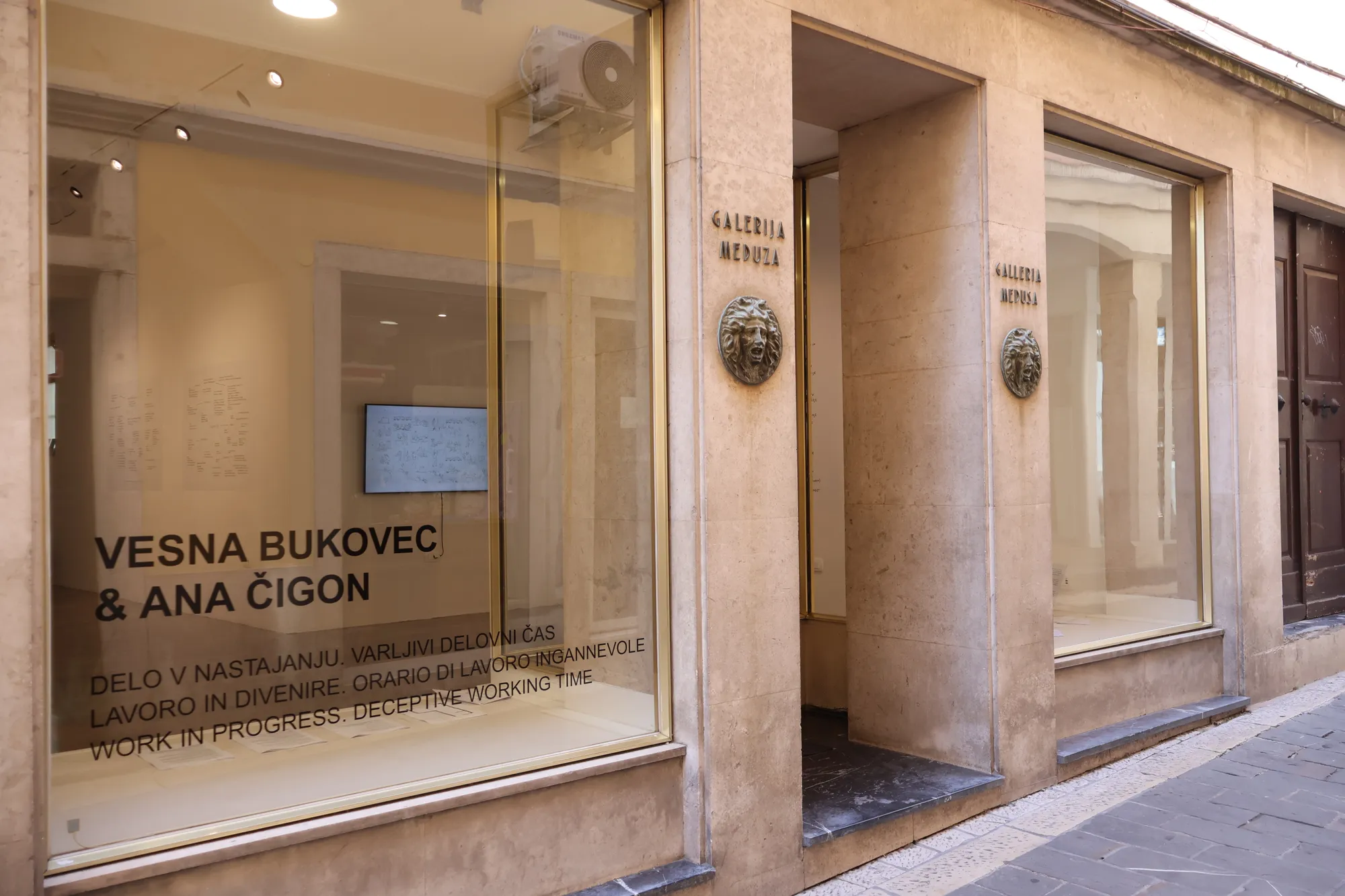 Kritični pogled do dela in sodobnih oblik izkoriščanja delavk in delavcev, kot so podaljševanje delovnega časa, atipične ne-varne oblike dela, kratenje delavskih pravic, hiperprodukcija in brezglave zahteve po stalni gospodarski rasti, katere cilj ni izboljšanje življenjskih standardov za najranljivejše, ampak kopičenje bogastva v rokah najbogatejših, vse pogostejši pojavi izgorelosti, ki so posledica vse bolj neživljenskih zahtev neoliberalizma, onesnaževanje okolja, ipd. so teme in problemi današnje družbe v njenem najširšem pomenu in obsegu. Delo v nastajanju z decentraliziranim razstavnim pristopom predstavlja večletno umetniško-kuratorsko raziskavo, ki jo kot kolektiv ustvarjajo vizualni umetnici Vesna Bukovec in Ana Čigon v sodelovanju s kuratorko Tio Čiček. Po prvi javni predstavitvi z naslovom Delo v nastajanju. Razmišljanja o skupnostih onkraj kapitalizma v Galeriji Škuc leta 2022 in naslednji razstavi s performansom Delo v nastajanju. Utopični počitek v GT22 v Mariboru leta 2023, je v teku tretja različica projekta z naslovom Delo v nastajanju. Varljivi delovni čas. Ta se je začela z bralnim krožkom ob knjigi Bulšihti Davida Graeberja, kjer so s sogovorkami_ci* razmišljale o tem, kako pogledi na vrednost in vrednotenje dela v knjigi rezonirajo z njihovimi življenji. V procesu raziskave sta umetnici brali tudi knjigi Restavracija kapitalizma: repatriarhalizacija družbe avtorice Lilijane Burcar in zbornik Odrast. Besednjak za novo dobo. Nastal je dokumentarni video Varljivi delovni čas (2024), v katerem mag. Ajda Pistotnik iz organizacije Policy Lab predstavi poglede na organiziranje dela in družbe, ki jih predlaga gibanje odrasti (degrowth). Profesorica dr. Lilijana Burcar pa naslavlja zgodovinske razlike pogojev dela za ženske v socializmu in kapitalizmu ter predstavi pomen sistemske emancipacije žensk. Video je bil v prvi različici predstavljen na projekciji in odprti diskusiji v ljubljanski Galeriji Škuc decembra 2024. Na razstavi v Galeriji Meduza pa bo predstavljena njegova dopolnjena različica. Na ogled bo tudi video Prekariat sveta … (2022) v katerem sindikalistka Tea Jarc, klasična filologinja, antropologinja in pisateljica dr. Svetlana Slapšak ter Jadranka Vesel z Raziskovalnega inštituta za socialno ekonomijo RISE razmišljajo o položaju sodobnih delavk_cev, skupnosti, preteklosti in prihodnosti. Poleg videov bodo razstavljene risbe na papirju in miselni vzorci, ki so nastali v različnih fazah umetniške raziskave. Razstavo septembra zaokrožamo z javno diskusijo.